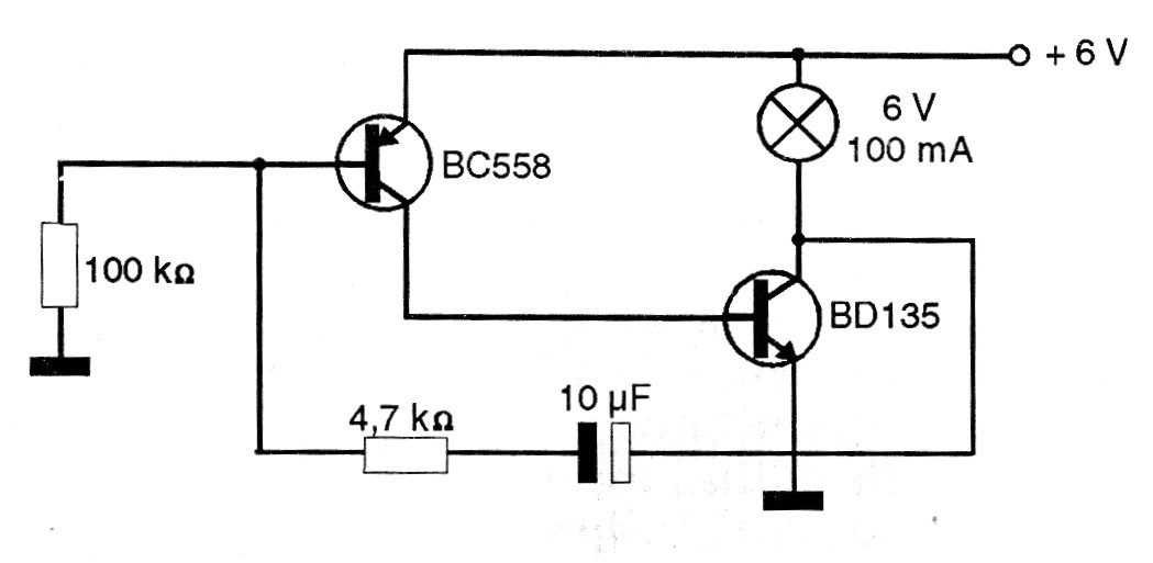 Este circuito se puede utilizar en la señalización de panel con lámpara incandescente común. La lámpara parpadeará a una velocidad dada por el capacitor de 10 uF y por el resistor de 100 k ohms. Estos componentes se pueden cambiar en una amplia gama de calores. De la misma forma, una lámpara de 12 volts permite que el circuito funcione con esta tensión de alimentación.