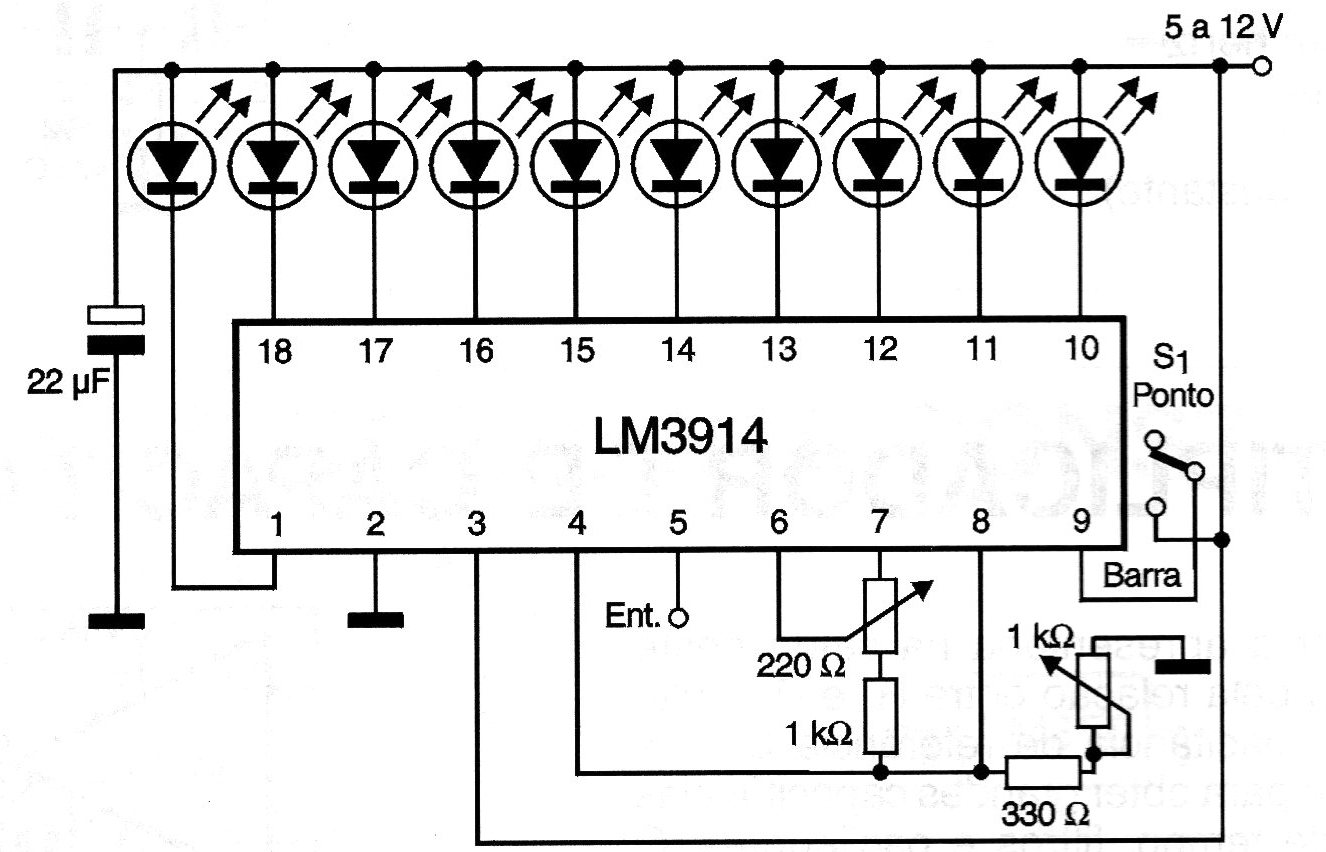 Este indicador de barra o punto móvil (bargraph) emplea el LM3914 y puede excitar 10 LEDs, de cualquier color. Entre las aplicaciones tenemos la indicación de tensión en instrumentos, indicador de nivel de reservorios o aún como VU-meter en aparatos de sonido. Los dos trimpots se ajustan para adaptar el rango de tensiones de entrada a la escala completa. A través de la llave S1 seleccionamos si el aparato funciona como escala de punto o barra móvil. El circuito funciona con tensiones de alimentación de 5 a12 V.