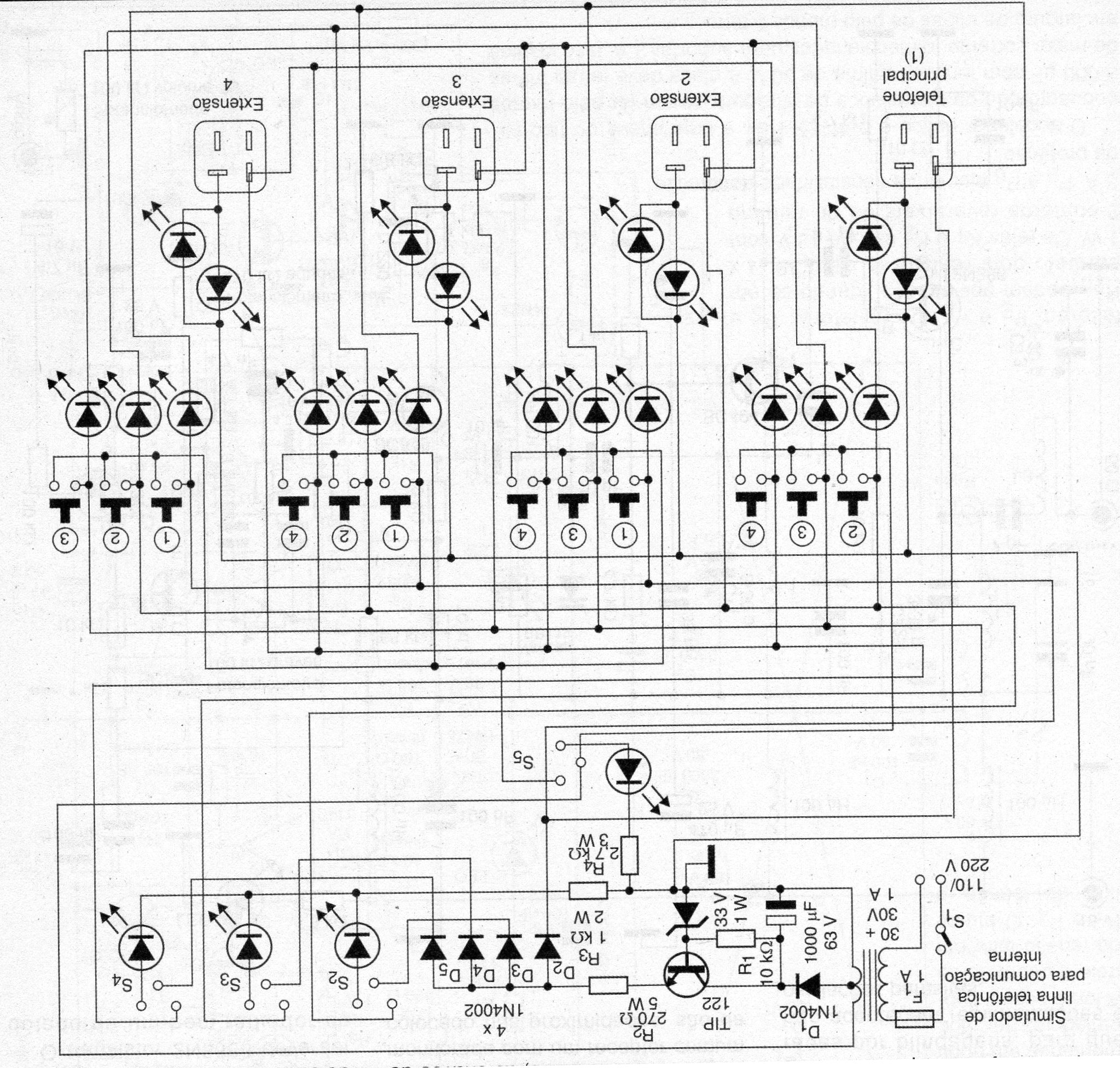 Este circuito es un simulador de línea telefónica, que puede ser usado en comunicaciones internas. Se ha diseñado para un teléfono principal y 3 extensiones pero puede tener hasta 7 extensiones. Es sólo añadir en el emisor del transistor TIP122, vía R2 diodos y llaves de 1 polo x 2 posiciones, hilos y LEDs. Siendo una línea con varias extensiones, debido a los diodos, podemos accionar la llamada a la extensión que deseamos presionando el interruptor NA o la tecla que se adapte al teléfono correspondiente al número de extensión. El autor pegó 2 planchas de metal fino (15 mm) en las placas de los teclados, bajo las teclas de los números de las extensiones (1,2,3 y 4). En las teclas pegó otras planchas (3 mm) para contacto cuando se presiona. El transformador y la placa con el circuito quedará instalado en una caja de 4 x 4 cm de la Pial. En la tapa de esta caja quedaron los LED, las llaves de 1 polo x 2 posiciones y la toma del teléfono principal, fusible y S1. Las claves sirven para desactivar las otras extensiones, para evitar la escucha de las conversaciones. Estas llaves, en la otra posición, al retirar el auricular del gancho, aplicarán corrientes en los LED que se encienden en las extensiones, indicando 2 extensiones ocupadas. S5 corta la llamada de las extensiones 2, 3 y 4. El transistor TIP122 debe estar dotado de radiador de calor. (2005)
