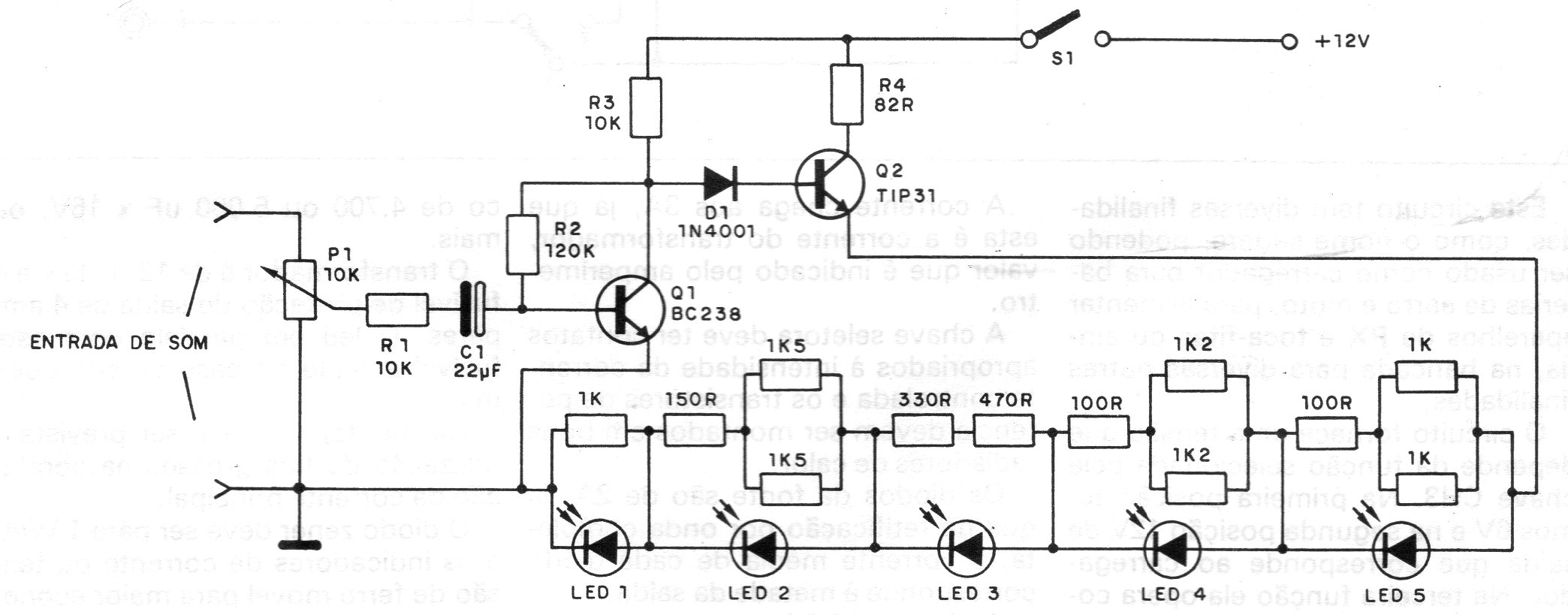 Encontramos este circuito en una publicación de 1987. El circuito se conecta a la salida de un amplificador y su aplicación original está en el coche. La alimentación se toma de la propia batería del coche y el potenciómetro P1 sirve para ajustar el punto de funcionamiento.