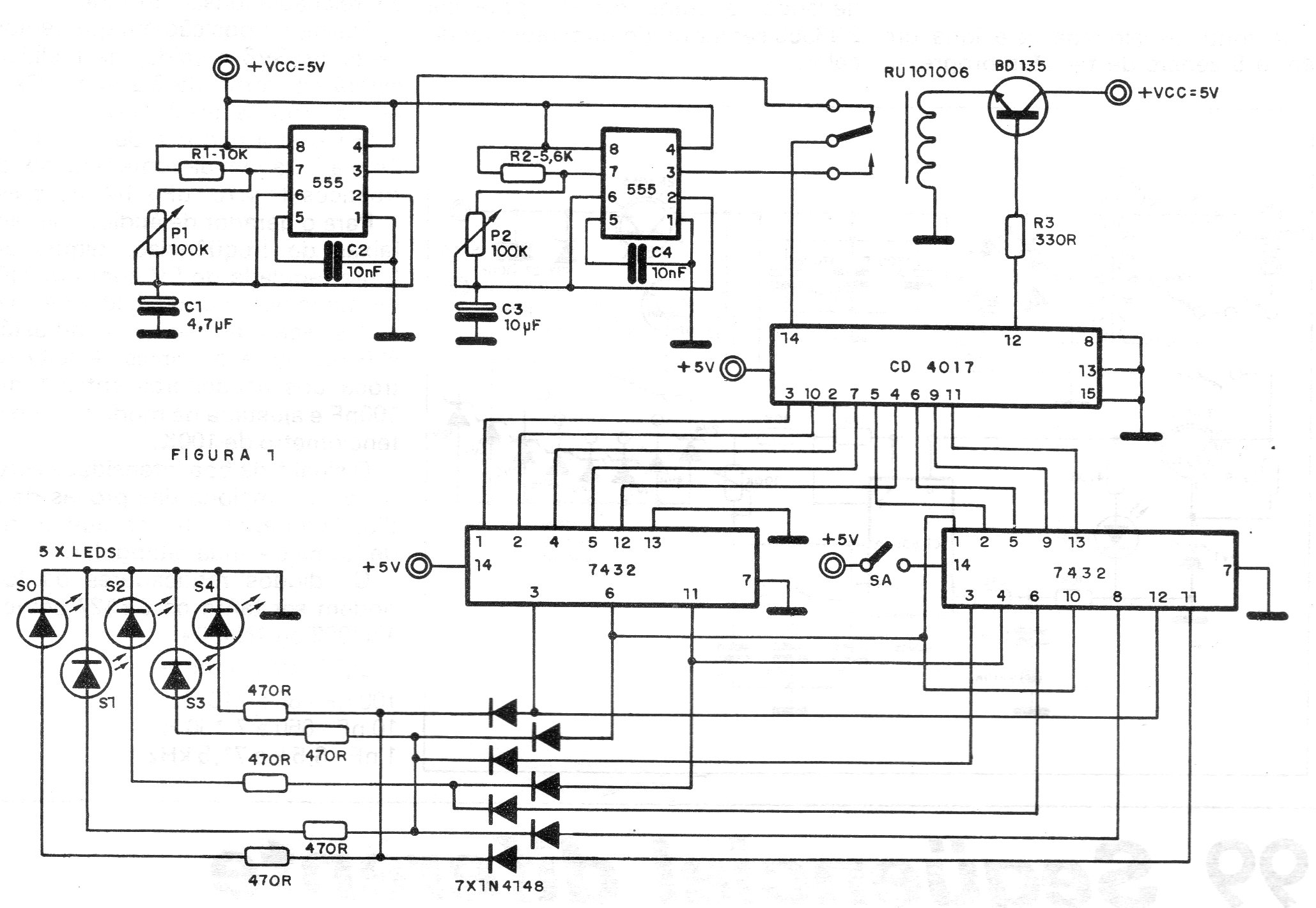 Encontramos este efecto de luz diferente en una revista de 1987. El circuito puede ser modificado para accionar etapas de potencia con SCR o Triacs para un efecto de alta potencia. La velocidad del efecto se ajusta en los potenciómetros junto a los integrados 555. El circuito tiene por diferencia producir los pulsos de conmutación para el contador TTL a través de un relé. La alimentación debe realizarse con una tensión de 5 V y el relé debe ser para esta tensión.