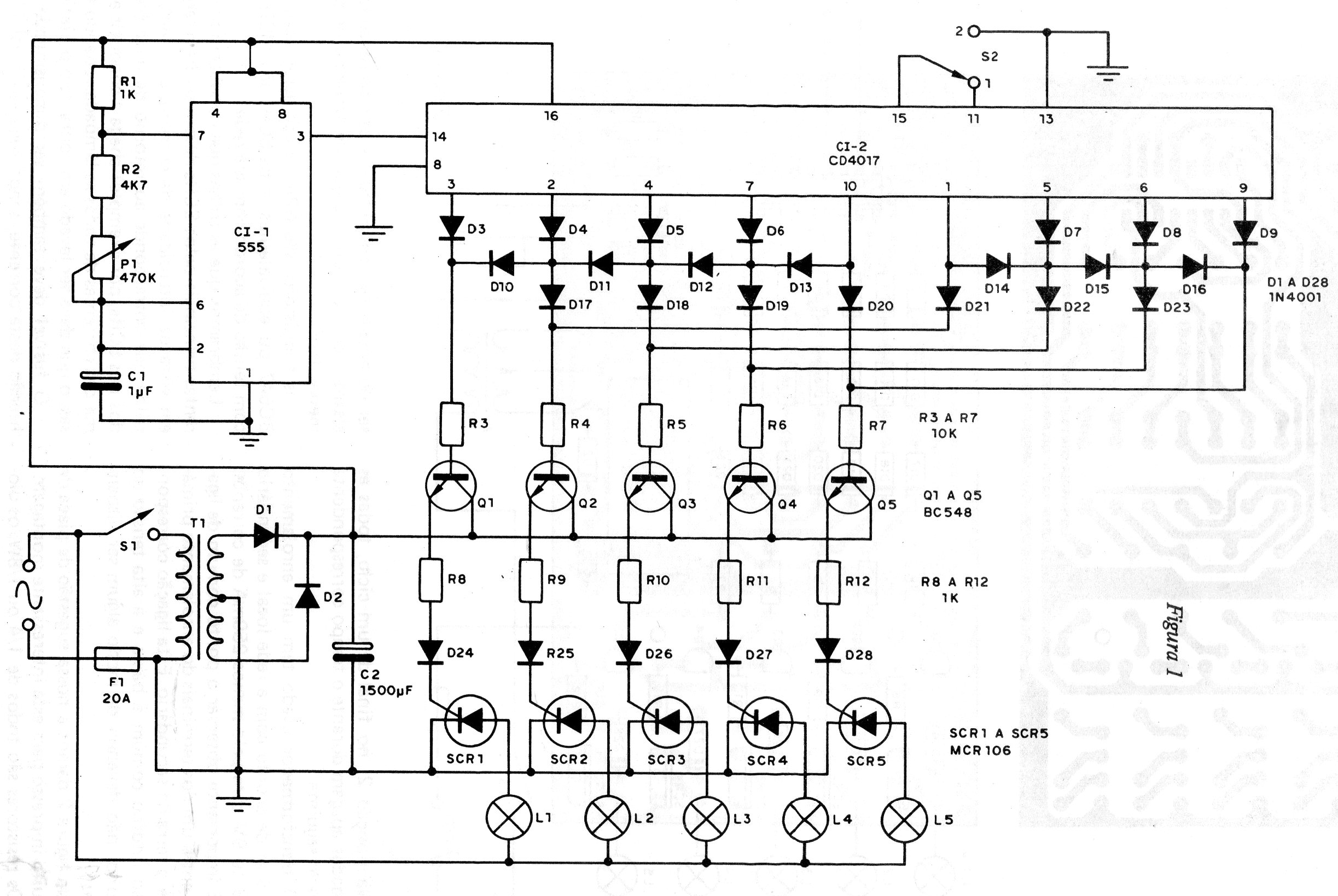 El nombre de este efecto obtenido en una documentación de 1985 se debe al modo en que las lámparas se encienden en secuencia. El movimiento es oscilante dado por los diodos de programación del 4017. El circuito sólo funciona con lámparas incandescentes y los SCR deben montarse en disipadores de calor.