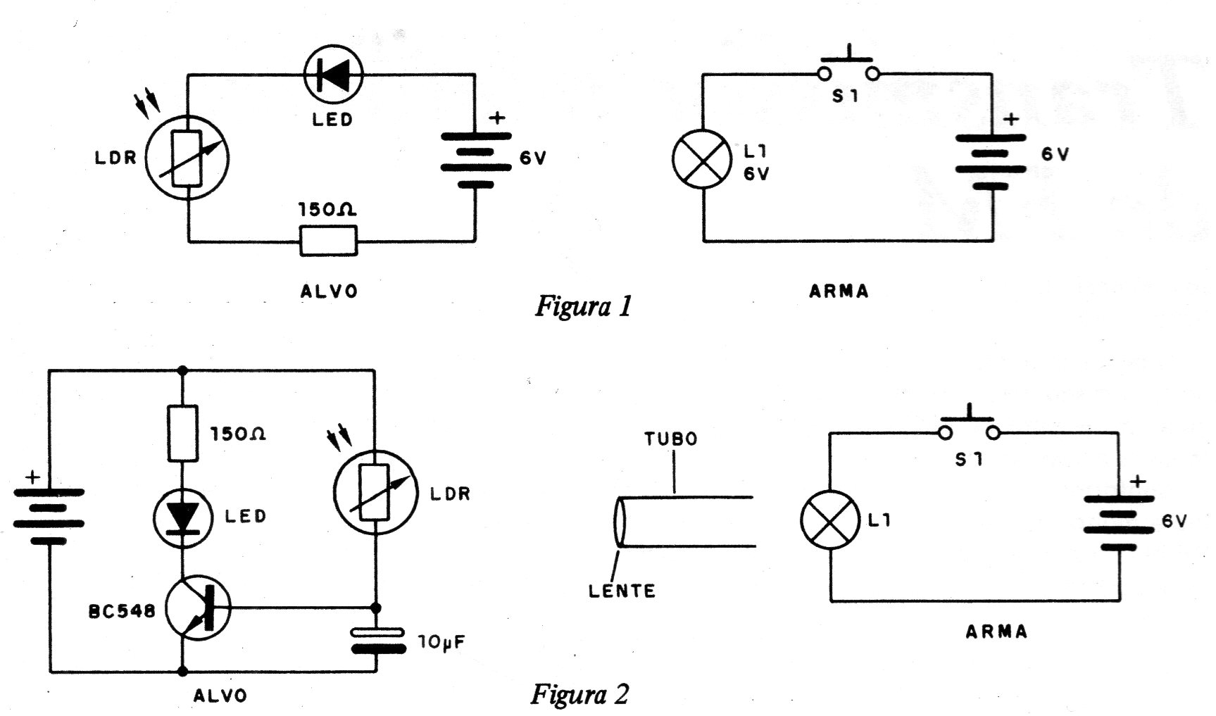 Estos simples circuitos de arma y objetivo con emisor y sensor fotoeléctrico fueron encontrados en una documentación de 1985. El arreglo físico queda por cuenta del lector. Los recursos ópticos deben usarse para dirigir el foco de luz emitido por las armas y recibidos por los LDR.