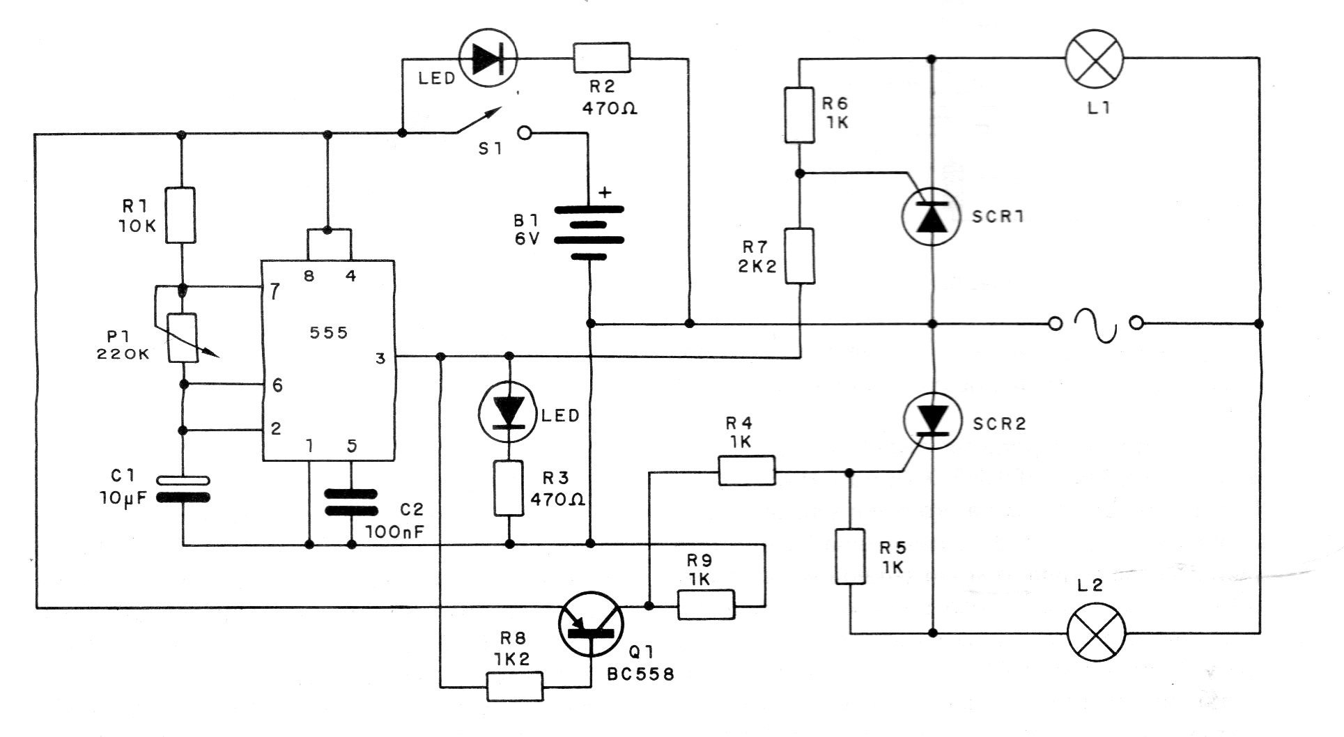 Este circuito, encontrado en una documentación de 1985, hace que dos lámparas incandescentes parpadeen alternativamente. La velocidad de los intermitentes se controla en P1. El circuito utiliza una batería auxiliar de 6 V (4 pilas), pero también se puede utilizar la fuente. Los SCR deben estar dotados de disipadores.