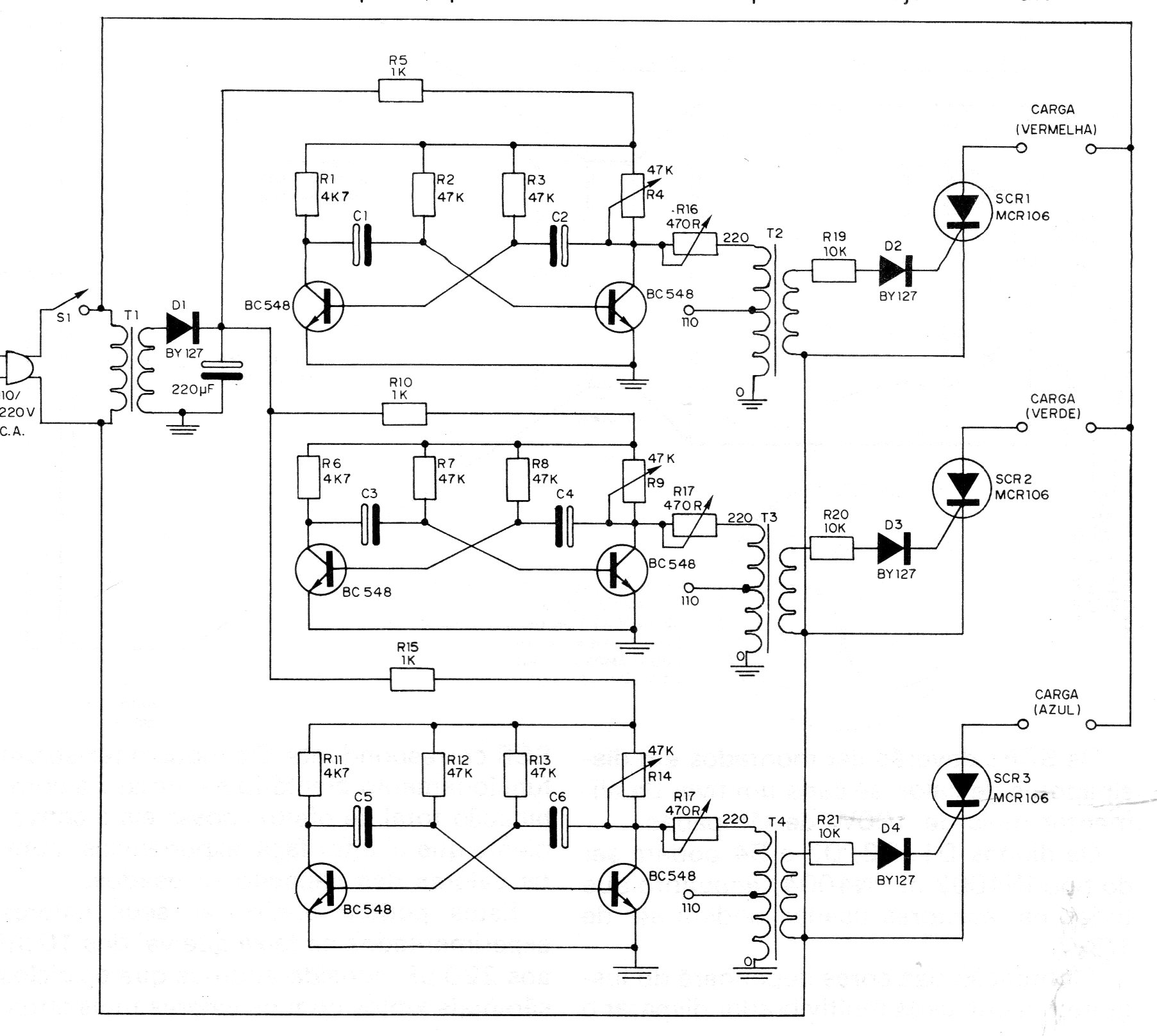 La idea de este efecto obtenido en una documentación de 1982 es hacer que las luces de color parpadeen al azar en una caja con un panel de acrílico u otro arreglo. La combinación de las lámparas produce diversos colores. Los transformadores, que pueden ser del tipo de alimentación común con 6 V de secundario, sirven para aislar el circuito de baja tensión del circuito de alta tensión. El circuito sólo funciona con lámparas incandescentes.