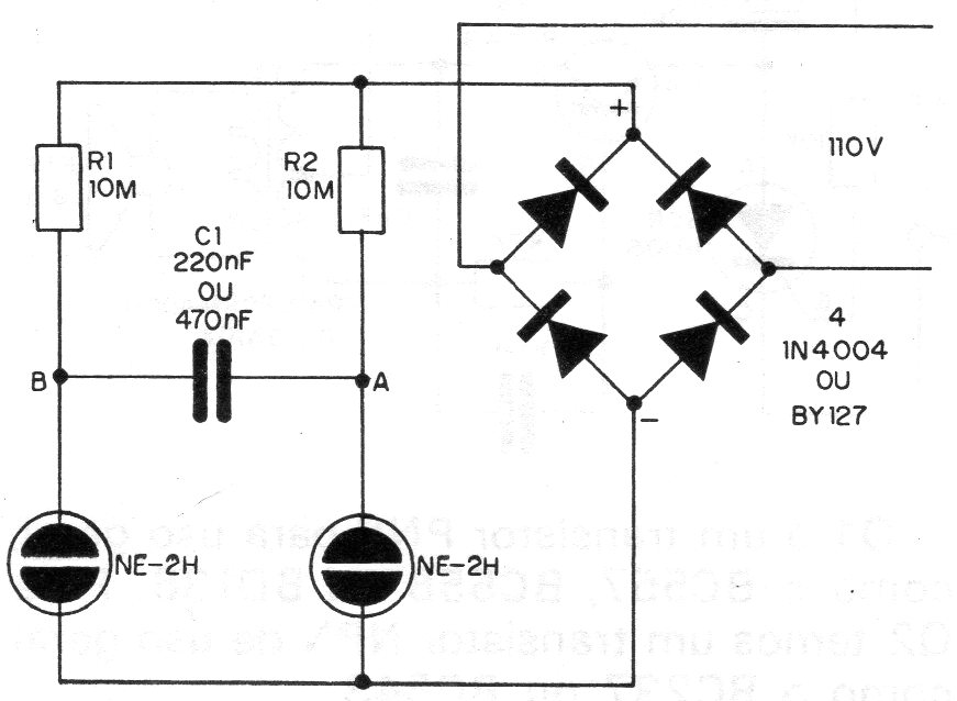 Este circuito simple consiste en un parpadeante para lámpara neon de muy bajo consumo y se encuentra en una documentación de 1982. El circuito puede ser alimentado por 110 V para diodos 1N4004 o 220 V para diodos 1N4007.