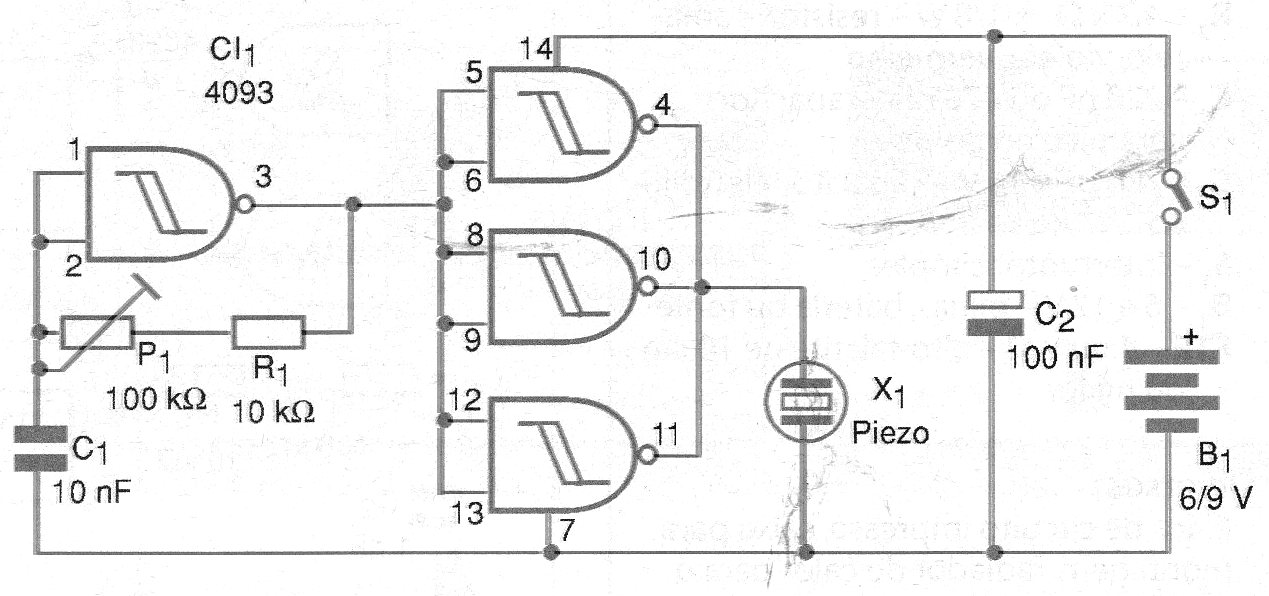 Según se afirma, quien pica son los insectos femeninos Las hembras por otro lado no soportan la competencia, alejándose del lugar en que existen otras hembras. Así, según fabricantes de repelentes electrónicos de insectos basta emitir un ruido que recuerde el zumbar de la hembra para que sean alejadas y así no piquen a las personas. Es claro que el sistema tiene su eficiencia puesta en duda si tomamos en cuenta que pueden existir insectos sordos y que no siempre las hembras que causa problemas se preocupan por el ruido ... Por supuesto, si el lector quiere experimentar el circuito , que se basa en versiones comerciales, vendidas en tiendas de artículos deportivos, el circuito se muestra en la figura. El circuito tiene bajo consumo, así que las pilas o la batería tendrán gran durabilidad. El transductor es del tipo piezoeléctrico de alta impedancia. P1 hace el ajuste de la frecuencia que, evidentemente, debe ser hecho experimentalmente. Si el circuito produce sonidos muy altos, un resistor de 10 k ohms a 100 k ohms puede ser conectado en serie con el transductor piezoeléctrico. El conjunto se puede instalar en una pequeña caja de plástico.