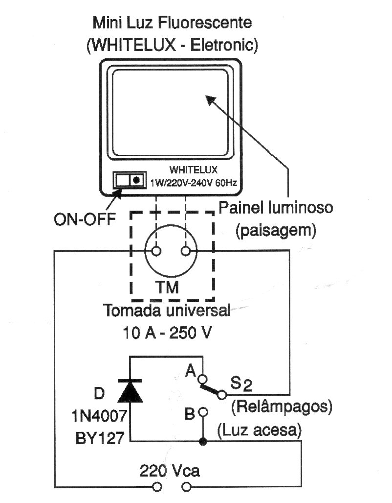 Este circuito simula relámpagos usando una pequeña lámpara fluorescente tipo White lux. El circuito es de una documentación de 2006. La luz tiene un brillo suave produciendo la sensación de un relámpago distante.
