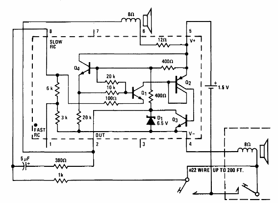 El circuito de corto alcance con cable es sugerido por National Semiconductor en documentación sobre el LM3909. La alimentación se realiza por una sola pila y la frecuencia dada por el capacitor que puede cambiar.