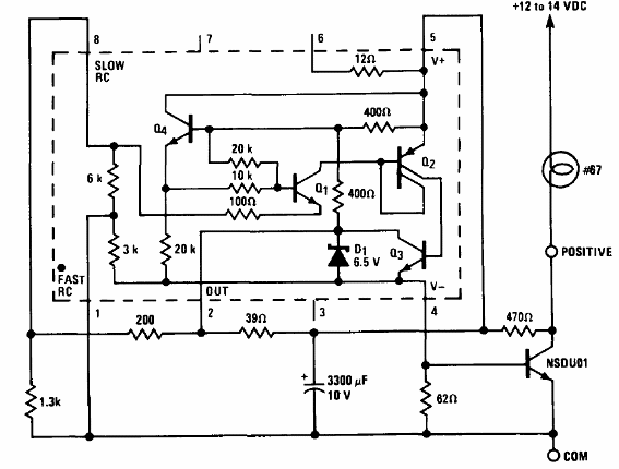 El circuito seleccionado hace que una lámpara de 12 V con corriente hasta 500 mA para el transistor BD135, parpadee a una frecuencia determinada por el capacitor externo. El circuito es sugerido por National Semiconductor en una documentación técnica.
