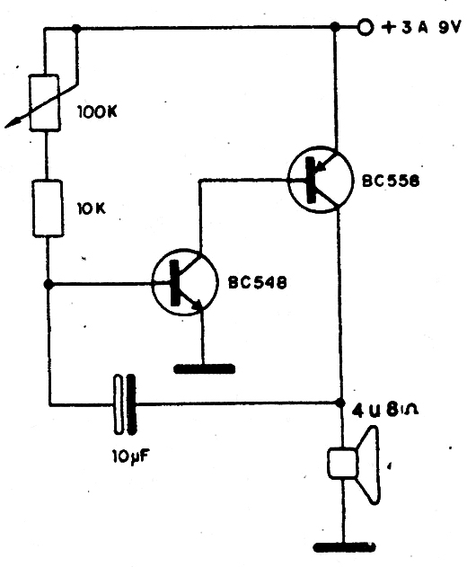 La frecuencia es controlada en el potenciômetro de 100 k y la banda de operación es dada por el capacitor electrolítico. Este capacitor puede ser alterado en la banda de 2,2 a 100 µF. El parlante es de 10 cm de 4 u 8 ohm de impedancia.