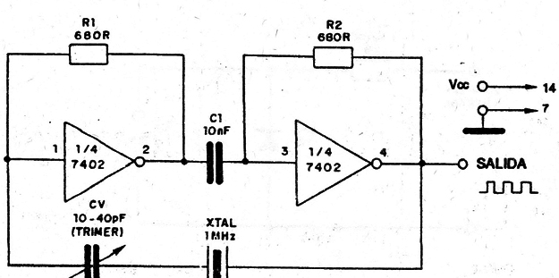 Este oscilador a cristal con integrado TTL usa dos de las cuatro puertas inversoras de un 7402 y opera con un cristal de 1 MHz. Se pueden experimentar cristales de otras frecuencias, dentro de los limites admitidos por el 7402, con eventual modificación de valor de CV. La alimentación debe ser de 5 V y la forma de onda obtenida en la salida es rectangular. Observe los pinos de alimentación que son el 14 y el 7.