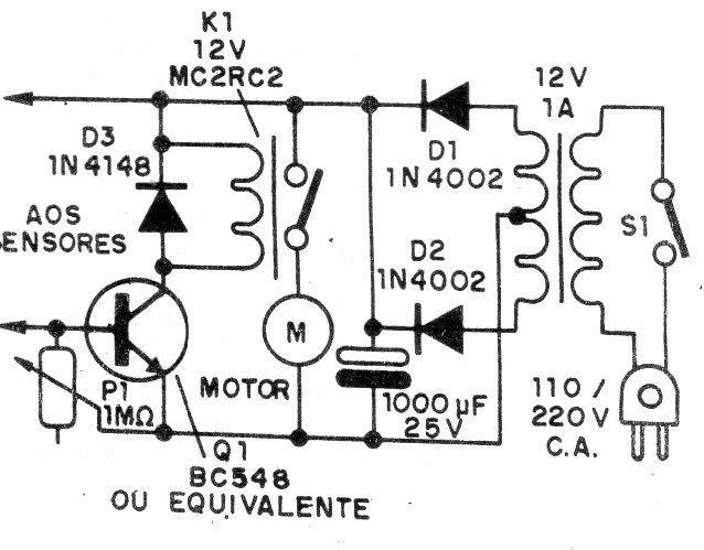 Este circuito acciona una bomba de agua cuando los sensores detectan falta de humedad en un vaso, por ejemplo. El circuito se alimenta de tensión según el relé y el motor. Los sensores son varillas de metal enterradas en el vaso.