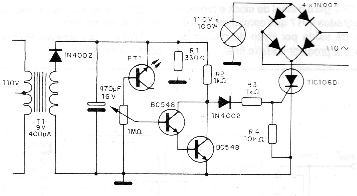 El sensor de este circuito encontrado en una publicación de 1993 puede ser cualquier foto-transistor. La lámpara debe ser incandescente con una potencia máxima de 100 W y el SCR debe estar dotado de un pequeño disipador de calor. El potenciómetro hace el ajuste de sensibilidad del punto de accionamiento de la lámpara.