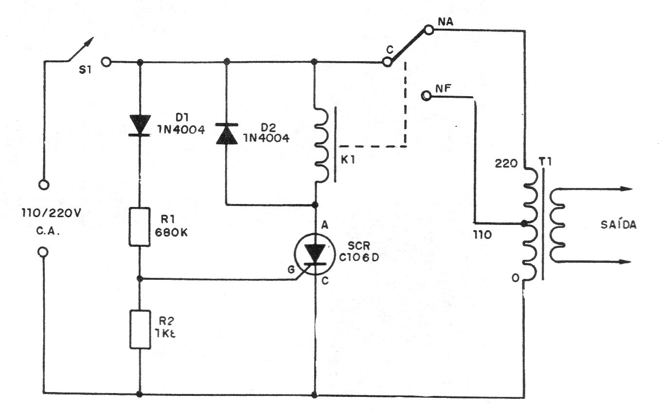 Este circuito, encontrado en una documentación de 1987, conmuta automáticamente la tensión de entrada de un transformador, según sea de 110 V o 220 V. La tensión de disparo del relé conmutador depende de las resistencias R1 y R2 que eventualmente pueden requerir pequeños cambios de valores. El relé es del tipo de 220 Vca con corriente de contactos de acuerdo con el transformador conmutado.