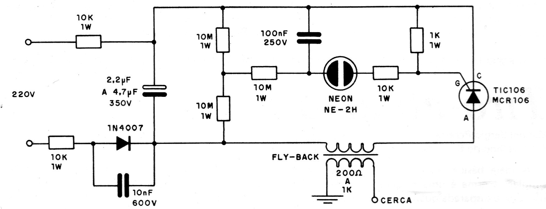 Encontramos este circuito en una documentación de 1985. El transformador es un flyback de TV antigua que tiene una parte del núcleo expuesto, donde se enrollan de 10 a 20 espiras de hilo común. El SCR debe tener un pequeño disipador de calor.