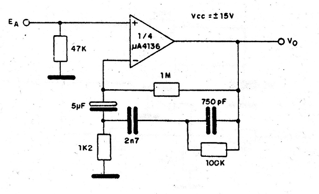 Mostramos solamente un canal de este preamplificador RIAA, sugerido por Fairchild, que tiene como base un integrado µA4136. El integrado es un amplificador operacional cuádruple y la fuente usada debe ser simétrica. La impedancia de entrada del circuito es de 47k, la que la hace ideal para fonocaptor magnético.
