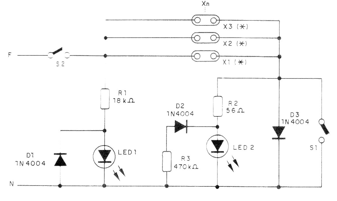 Este circuito monitorea a través de LED la alimentación de diversas tomas en un banco. El circuito sirve tanto para la red de 110 V como 220 V. El circuito es de una documentación de 1995. Para la red de 220 V utilice diodos 1N4007.