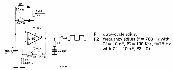 Encontramos este oscilador que puede suministrar hasta 3 A de salida en el manual de circuitos integrados lineales de la SGS de 1982. La frecuencia depende de C1 con la información dada en el diagrama. P1 controla el ciclo activo.