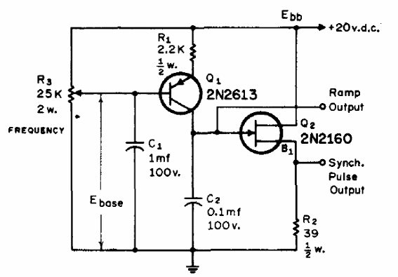 Encontramos este circuito en una documentación de 1972. El transistor, en realidad es un unijuntura que puede ser el 2N2646. El transistor bipolar es el BC558. Con los valores indicados para los componentes la rampa puede tener frecuencias entre 100 y 4000 Hz.