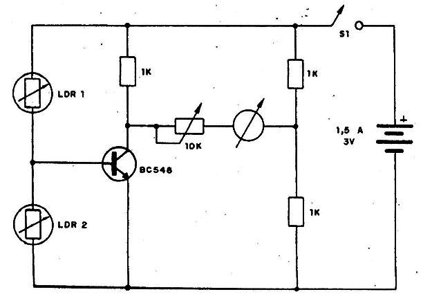 Este circuito compara la intensidad de luz de dos fuentes, incidentes en dos LDRS. Se obtiene com esto una indicación de la diferencia de luz, siendo el instrumento indicador un VU de 200 µA. La alimentación se hace con una o dos pilas pequeñas y el trimpot permite ajustar el punto de fin de escala para el instrumento.