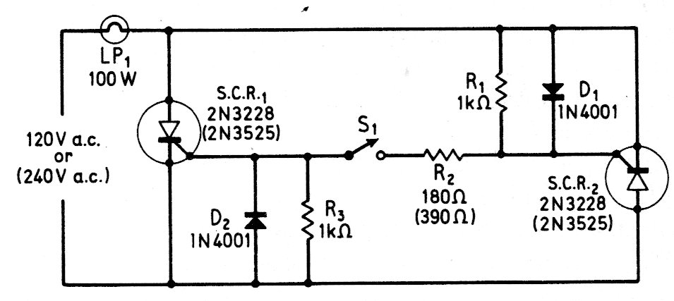 Esta clave de potencia de onda completa utilizando SCR ya ha sido explorada en otros artículos de este sitio. Esta configuración es de una publicación inglesa de los años 80. Los SCR pueden ser tipos más comunes actualmente como los de la serie TIC que deben montarse en disipadores de calor.