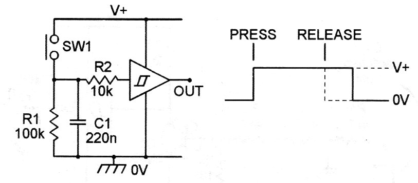 Esta es una de las muchas configuraciones de deboucer o anti-repique que el lector puede encontrar en este sitio. En el caso, se puede utilizar un 4093 como inversor y los valores de los componentes se pueden cambiar según la aplicación. Este circuito se puede utilizar como escudo de entrada para microcontroladores.