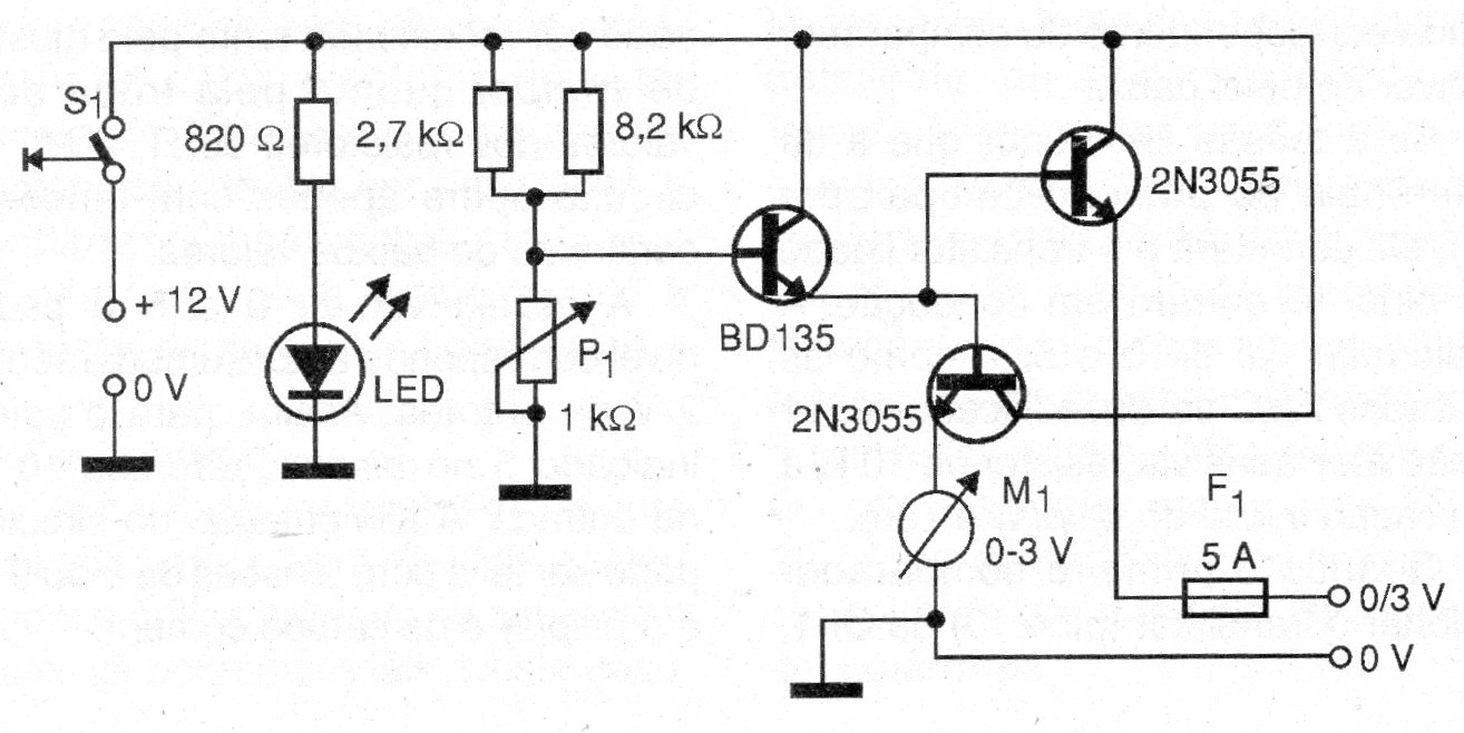 Los filamentos de las velas de aeromodelos operan con una baja tensión del orden de 1,5 V. Esta fuente es justamente indicada para dar la salida en el motor, cuando esta tensión debe ser aplicada a las velas. El circuito es de 2004 y hace uso de la tensión de 12 V que se puede obtener de una batería de coche o menor. La corriente es del orden de algunos amperios. Observamos que en el diseño original de la publicación el M1 está conectado de forma incorrecta. El emisor debe ir directamente a la salida de 0 V que a su vez está conectada a la tierra. M1 debe ir del punto de 3 V a la tierra.