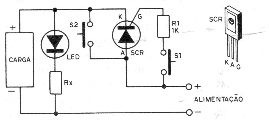 Este circuito de 1977 es una aplicación simple y directa de un SCR, ya explorada en muchos artículos de este sitio. El circuito se bloquea cuando se presiona por un instante S1. El circuito puede ser usado con cargas de 6 a 12 V, recordando que hay una caída de tensión del orden de 2 V en el SCR.