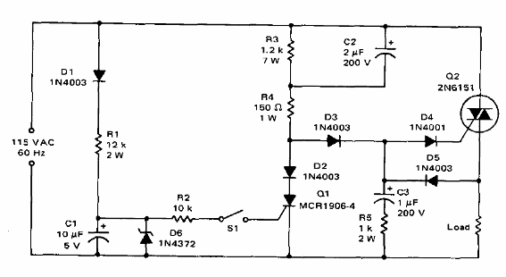 Este circuito está indicado para el control de cargas resistivas. Cuando S1 se abre el triac conecta cerca del paso por cero del primer ciclo de la alimentación. El circuito es del "Circuit Applications fdor the Triac" de Motorola de 1971. El triac admite equivalente de acuerdo con la corriente de la carga. Este componente debe estar dotado de un disipador de calor.