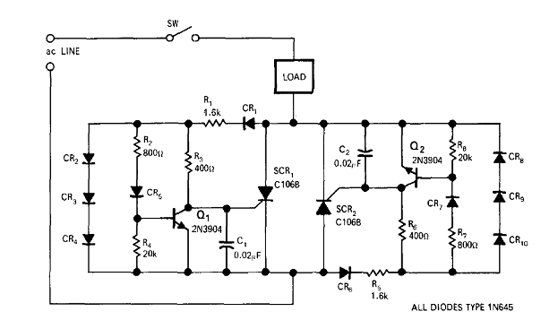 Este circuito hace la conmutación de una carga en 0,013 ms después del cierre del interruptor y después del inicio de cada ciclo. Los SCRs deben tener capacidades de corriente de acuerdo con la carga y los transistores pueden ser los BC548. El circuito es de una documentación técnica de 1971. Los SCR deben montarse en disipadores de calor.