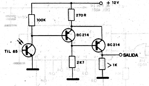 Este disparador usa dos transistores PNP y es sugerido por Texas Instruments. Con la incidencia de luz en el fototransistor, el primer transistor conduce la corriente haciendo que el segundo sea llevado al corte. La tensión en la salida en estas condiciones cae a un valor mínimo en una transición bastante rápida.