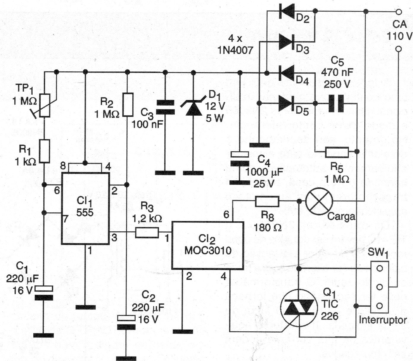 Este circuito se encuentra en una documentación de 2005. El triac debe estar dotado de un disipador de calor y el tiempo se ajusta en P1 hasta unos minutos. Los mayores intervalos de tiempo pueden obtenerse con el aumento de C1. El circuito utiliza fuente sin transformador.