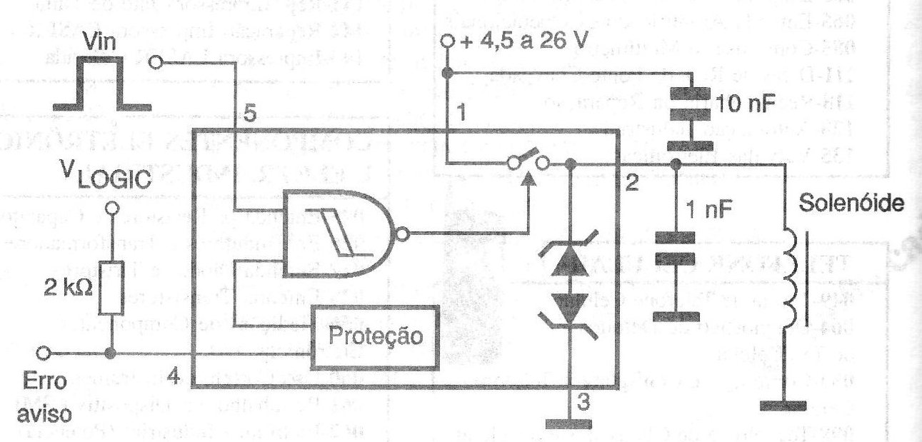 El circuito ilustrado en la figura es sugerido por National Semiconductor y indicado para el control de solenoides en automatismos, electrónica automotriz y mecatrónica a partir de señales lógicas (shield). Su corriente quiescente es de apenas 10 pA y cargas de hasta 1 A pueden ser controladas. También muestra una salida de error que proporciona una señal cuando se produce un cortocircuito en la carga, sobrecarga o incluso una inversión accidental de la batería. El circuito está diseñado para soportar transitorios de hasta 80 V y puede ser alimentado con tensiones de 4,5 a 26 V.