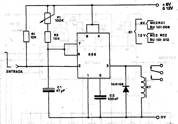 El disparo de este circuito monoestable se hace por una transición negativa de la tensión de entrada, que debe caer de +B a 0 V. El tiempo de accionamiento del relé es ajustado en P1 y se puede calcular mediante la expresión: T = 1,1 x R x C. En esta expresión R es la resistencia total representada por la suma de R2 con P1.