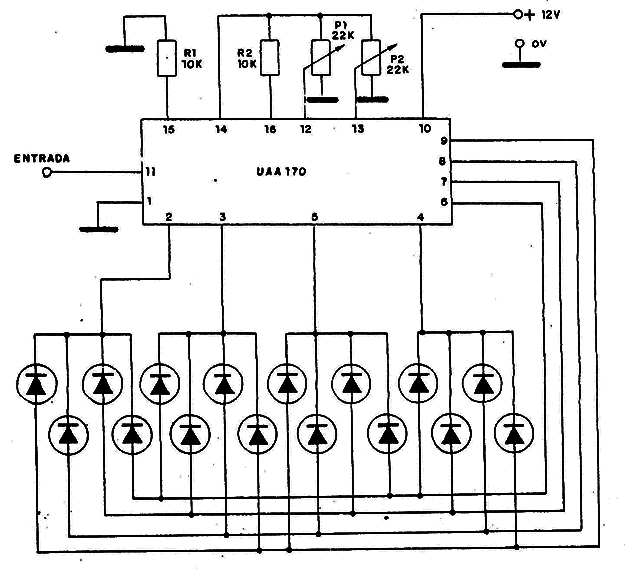 Esta es una escala de punto móvil (un LED enciende solamente en cada instante, según la tensión de entrada). con 16 LEDs. usando el integrado µAA170. Los limites de tensión en la entrada con 10 k de impedancia, aproximadamente, se lijan por P1 y P2 quedando entre 0 V y un poco debajo de la tensión de alimentación que es de 12 V. Los LEDs pueden ser de colores diferentes.