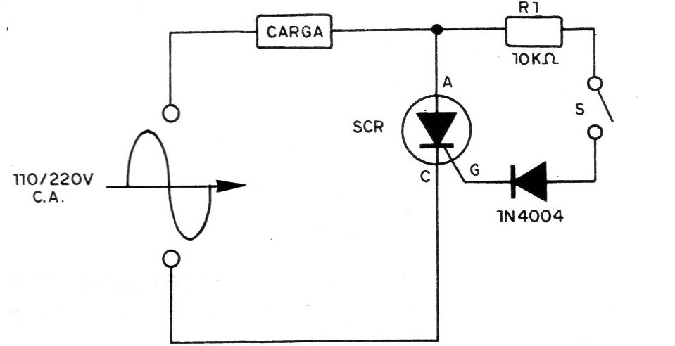 Este circuito muestra cómo controlar una carga de potencia usando una llave de baja corriente. El circuito es de media onda y la corriente máxima controlada depende del SCR. El SCR debe estar dotado de un disipador de calor. Los SCR de la serie TIC se pueden utilizar con tensión de acuerdo con la red de alimentación.