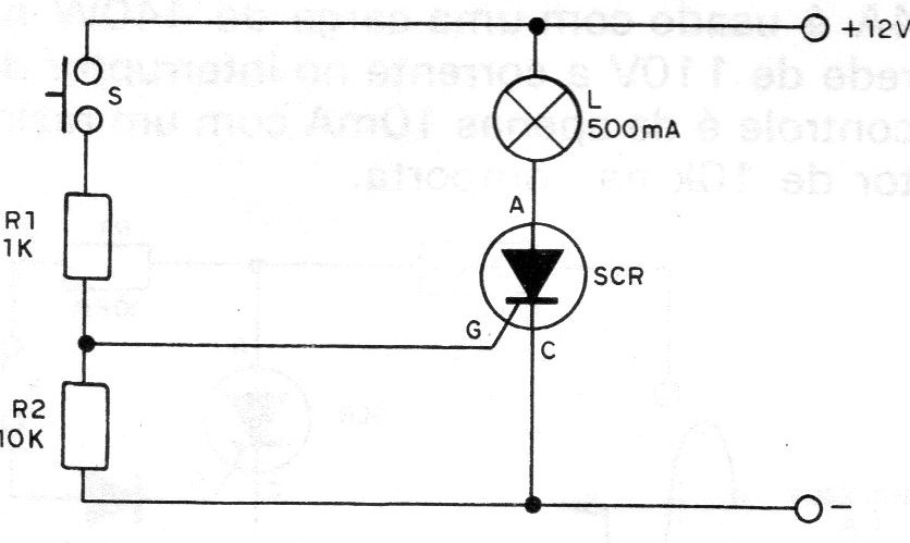 En la figura tenemos un circuito muy simple de disparo para un SCR que alimenta una lámpara de 12 V cuya corriente debe situarse entre 20 y 500 mA. Cuando el interruptor de presión se acciona momentáneamente, el SCR se lleva a su estado de plena conducción alimentando la lámpara que entonces se encender y permanecerá hasta que la alimentación se desconecte momentáneamente.
