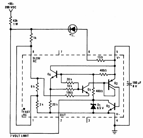 El circuito presentado hace que un LED parpadee con tensiones de 85 a 200 V continuas y tiene un consumo bajo. La base es un CI de bajo consumo de National Semiconductor. La frecuencia de los intermitentes es dada por el capacitor externo.