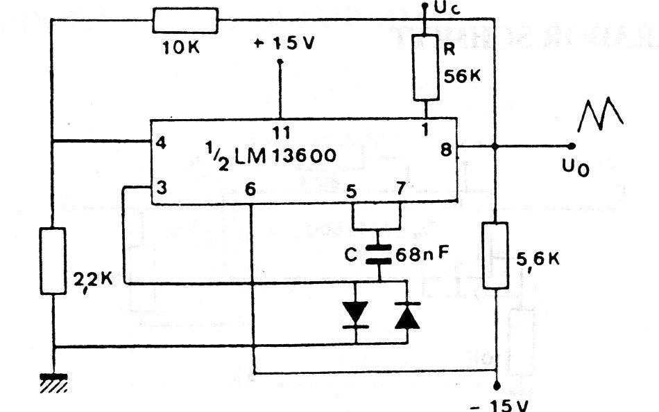 El circuito integrado utilizado en esta configuración de una documentación antigua no es muy común actualmente. El circuito genera señales triangulares cuya frecuencia depende de R y de C. El circuito debe ser alimentado por una fuente simétrica. La frecuencia es controlada por una tensión aplicada a Uc.