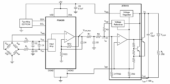 El circuito presentado es sugerido por Texas Instruments (www.ti.com) en su Application Report SBOA107B y emplea como base dos circuitos integrados de la empresa, el XTR115 y el PGA309. La finalidad del circuito de la figura es generar una señal de 4 mA a 20 mA para interfaz entre sensores y circuitos de procesamiento en el modo de corriente.