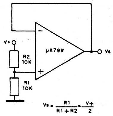 Esta fuente de referencia tiene su tensión de salida determinada por la relación R2/R1 a partir de +V. El integrado es un µA799 de Fairchild, y debe ser usada una fuente simétrica. El integrado funciona como un seguidor de tensión en esta configuración.