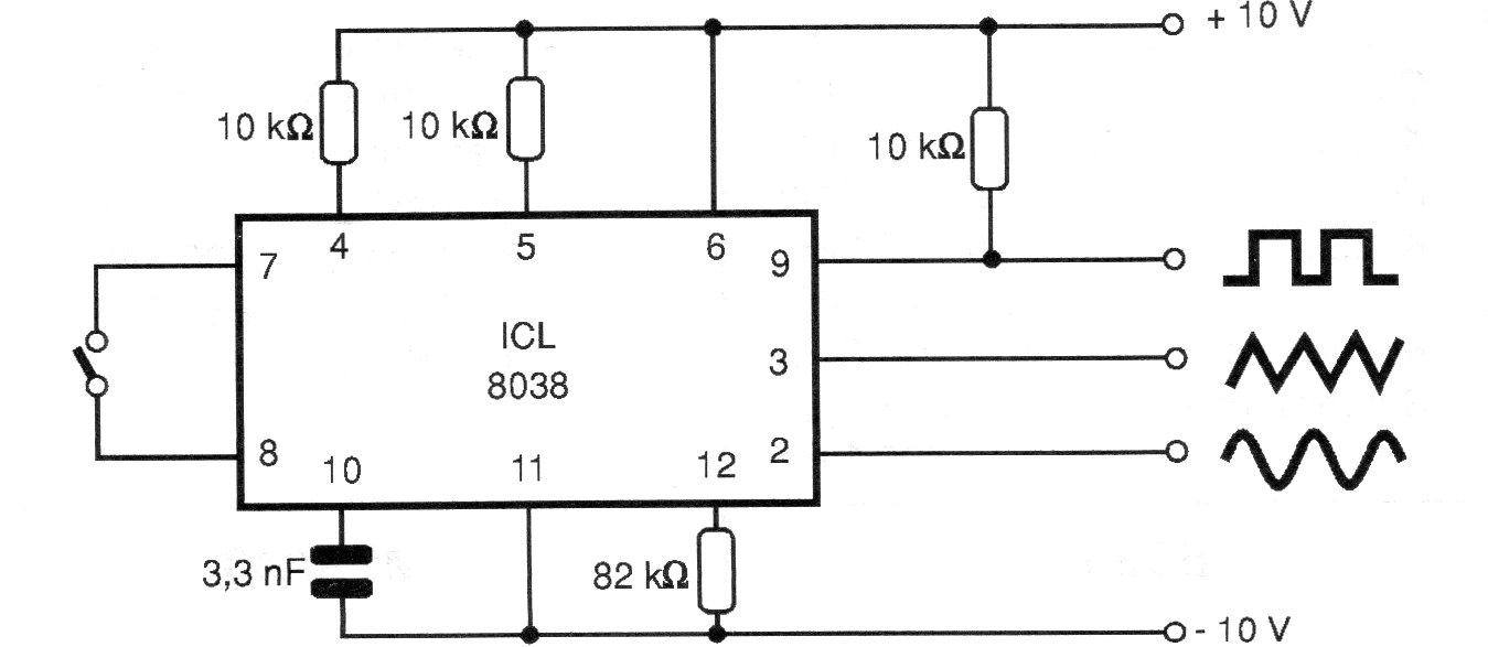 Este circuito aparece en otros lugares de este sitio. Si bien el 8038 no es un componente de fácil obtención, resulta en un excelente generador de funciones con 3 formas de onda de salidas disponibles y frecuencias de 0,001 Hz hasta 100 kHz.