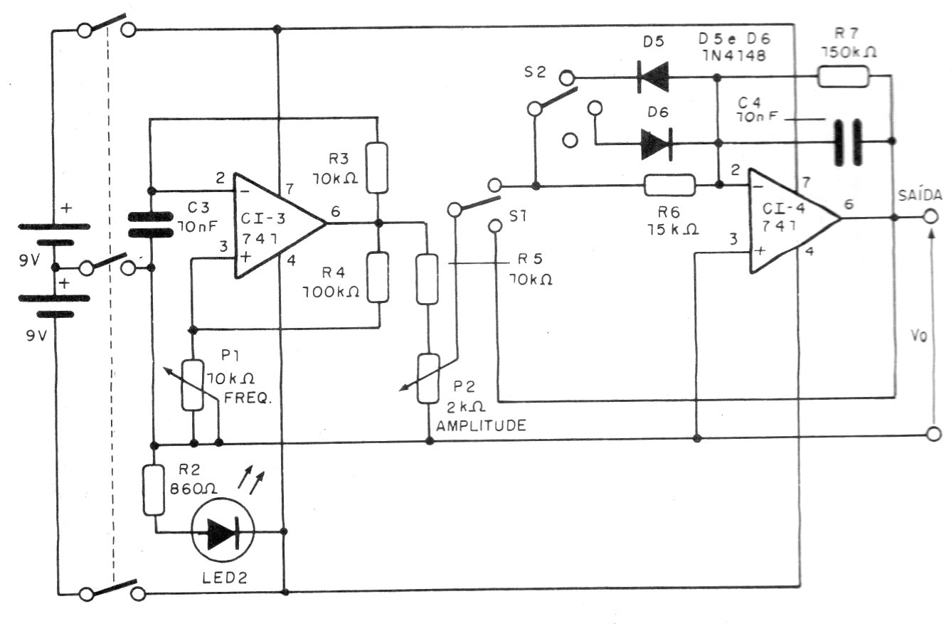 Este generador de funciones, con su fuente de alimentación es de una documentación técnica de 1993, pero puede ser montado con facilidad por los componentes que usa. El circuito genera frecuencias de 100 Hz a 100 kHz pero se pueden cambiar C3 y C4 para operar en otras pistas. El circuito debe ser alimentado por una fuente simétrica de 6 a 12 V o dos baterías de 9 V, como se indica.