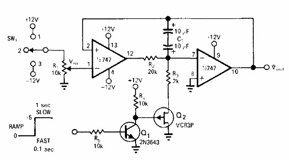 Este circuito es de una documentación de 1971. Genera una rampa dada por la señal de entrada. El FET puede ser el BF245 y el bipolar el 2N2222. El 747 consiste en un doble operativo similar a los 741.