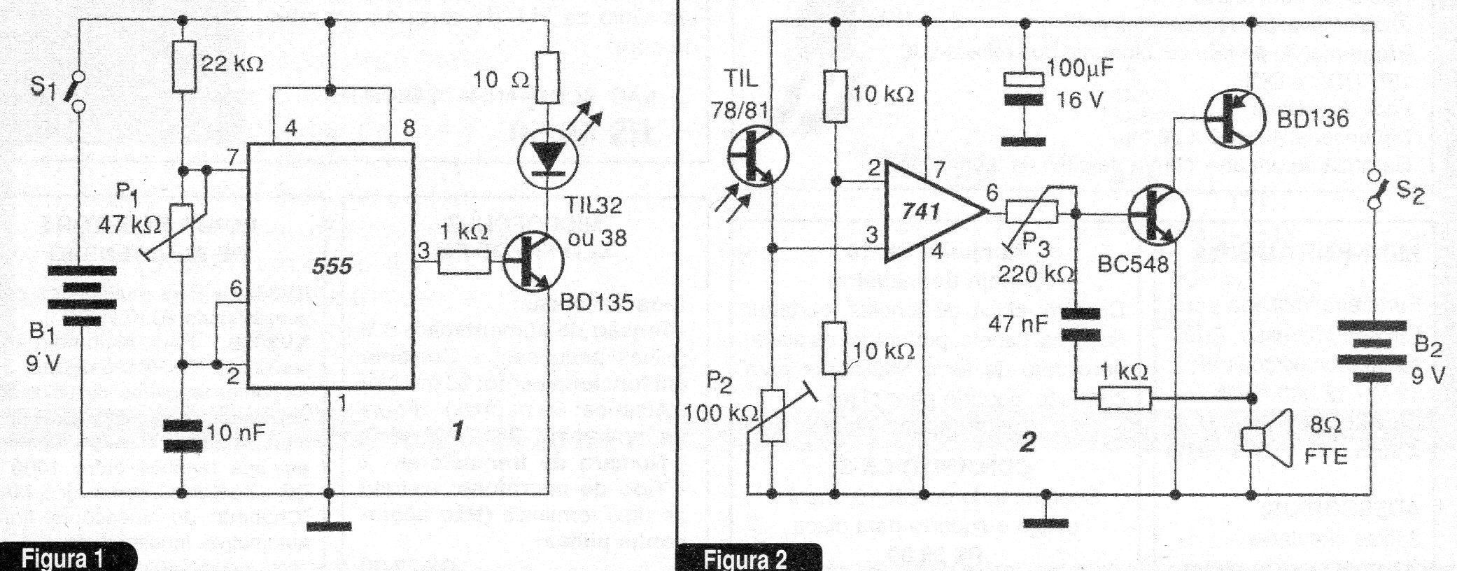 Con este circuito el deficiente visual puede localizar con facilidad locales importantes dentro de casa como: cama, sala, baño, etc. Esto es posible gracias a la característica de propagación rectilínea de los rayos infrarrojos que conduce a su utilización de forma direccional. Así, tenemos un emisor (figura 1) que quedará en posesión del usuario, y un receptor (figura 2) que emite una señal sonora al ser localizado por el emisor. De esta forma, instalar un receptor en cada lugar que deba ser localizado y se ajusta P3 para producir diferentes tonos de identificación. Basados ??en los sonidos, los discapacitados pueden localizar e identificar con facilidad los lugares marcados con los detectores. Los potenciómetros P1 y P2 deben ajustarse para proporcionar una mayor sensibilidad en la recepción. El circuito del emisor puede montarse en una caja de control remoto común de TV u otro aparato, para mayor facilidad de manejo por el deficiente.