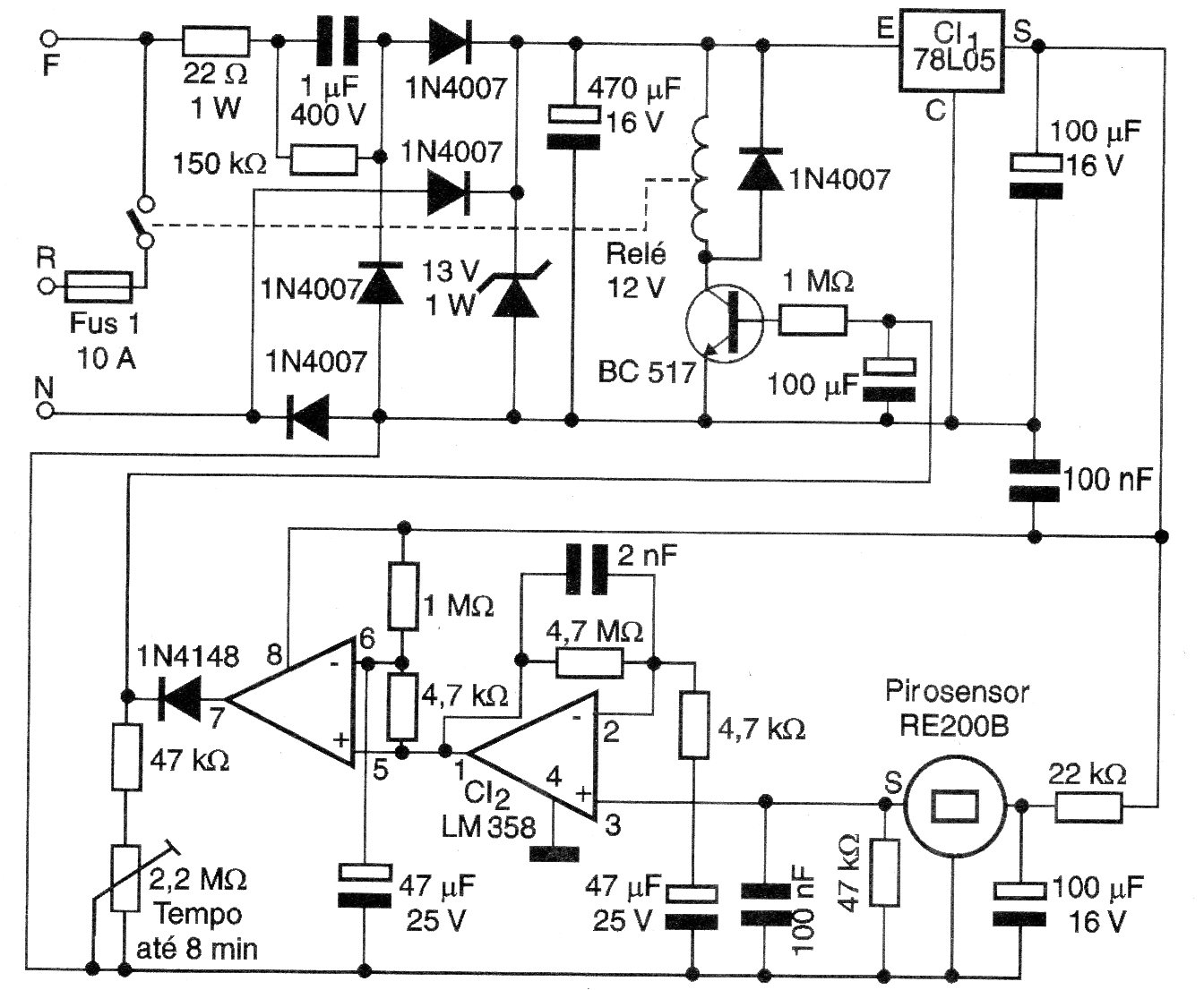 Encontramos este circuito en una documentación de 2005. El circuito utiliza un piezo-sensor infrarrojo accionando un relé. El circuito es algo crítico y la fuente de alimentación utilizada no utiliza el transformador. El sensor utilizado puede ser difícil de encontrar actualmente.