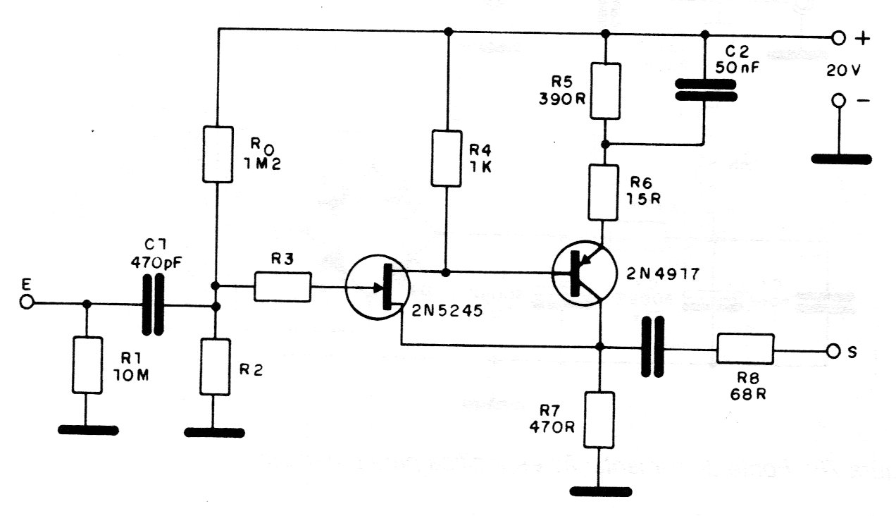 Este amplificador o booster de antena para receptores de 100 kHz a 30 MHz fue publicado en una documentación técnica sobre FET de los años 80. El transistor bipolar puede ser el BF494 y la alimentación puede ser hecha por dos baterías de 9 V, ya que el consumo es muy bajo o la fuente de CIR5872S ..