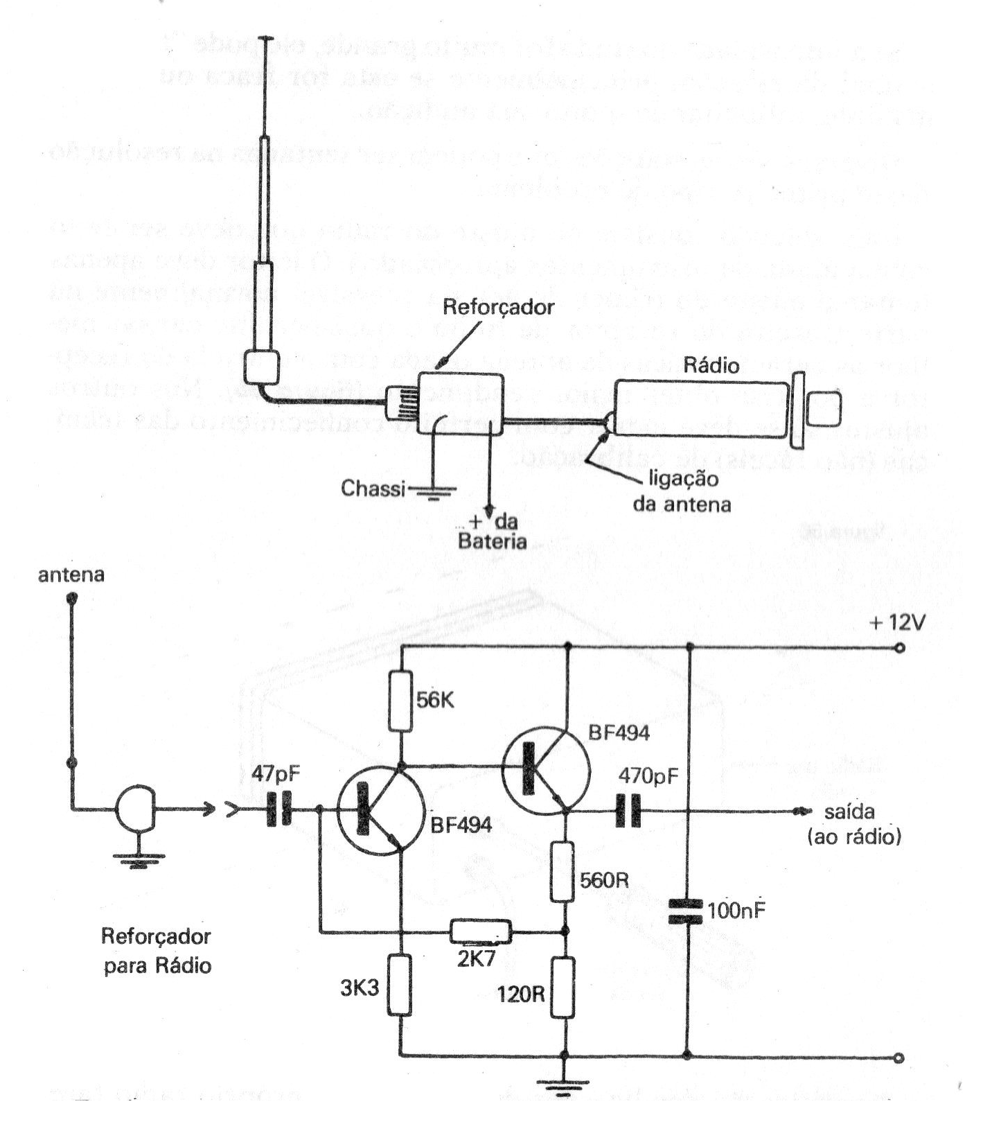 Este circuito de amplificador para señales en la banda de ondas medias y cortas puede ser usado con radios de coche o radios de mesa, con una antena telescópica, preferiblemente externa. El circuito tiene bajo consumo que puede ser alimentado por batería de 9 V o 12 V o fuente de alimentación.