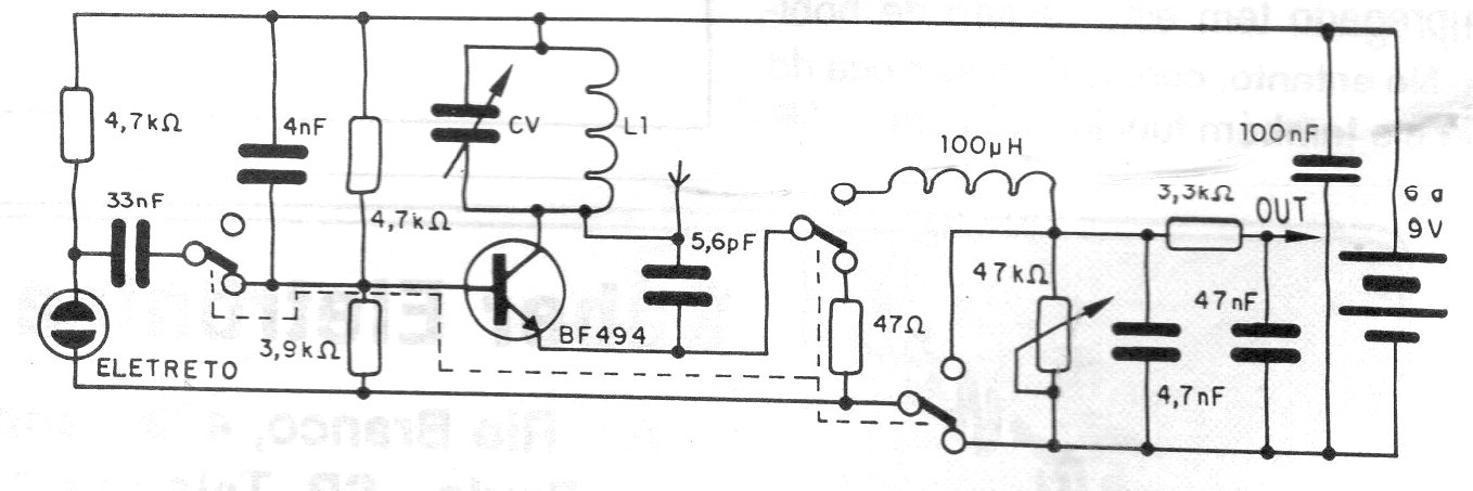 Este circuito fue encontrado en una documentación de 1994. Su señal se aplica a cualquier pequeño amplificador integrado como el TDA7052. La bobina consta de 4 espiras de hilo 24 o 26 en forma de 1 cm sin núcleo. La antena tiene de 15 a 40 cm y el alcance es del orden de 50 metros. La alimentación se realiza por batería de 6 o 9 V.